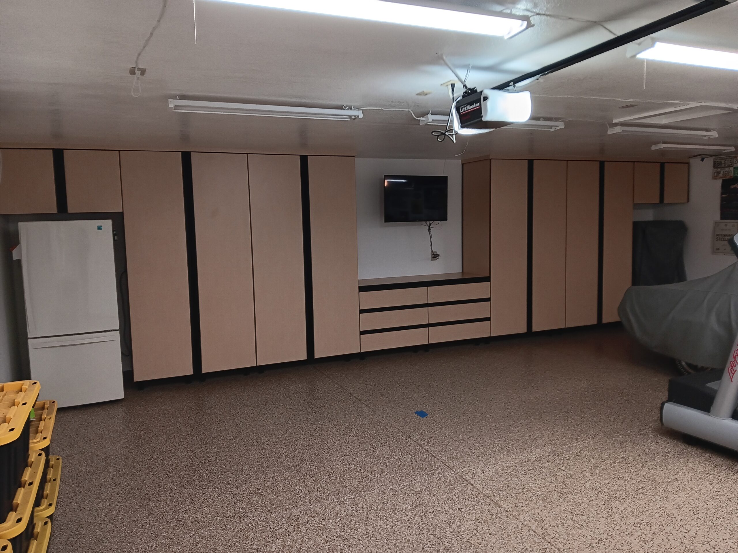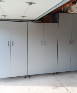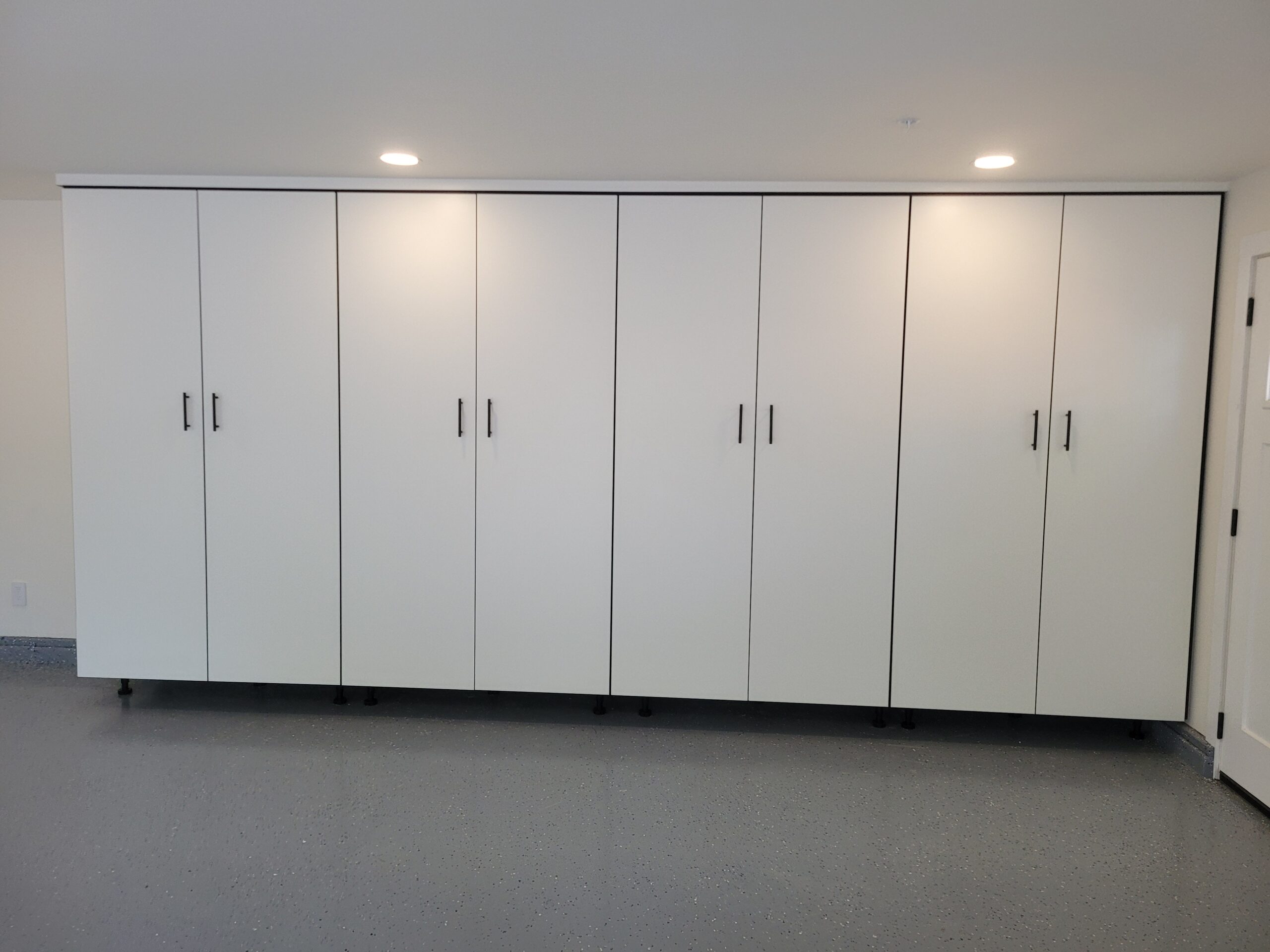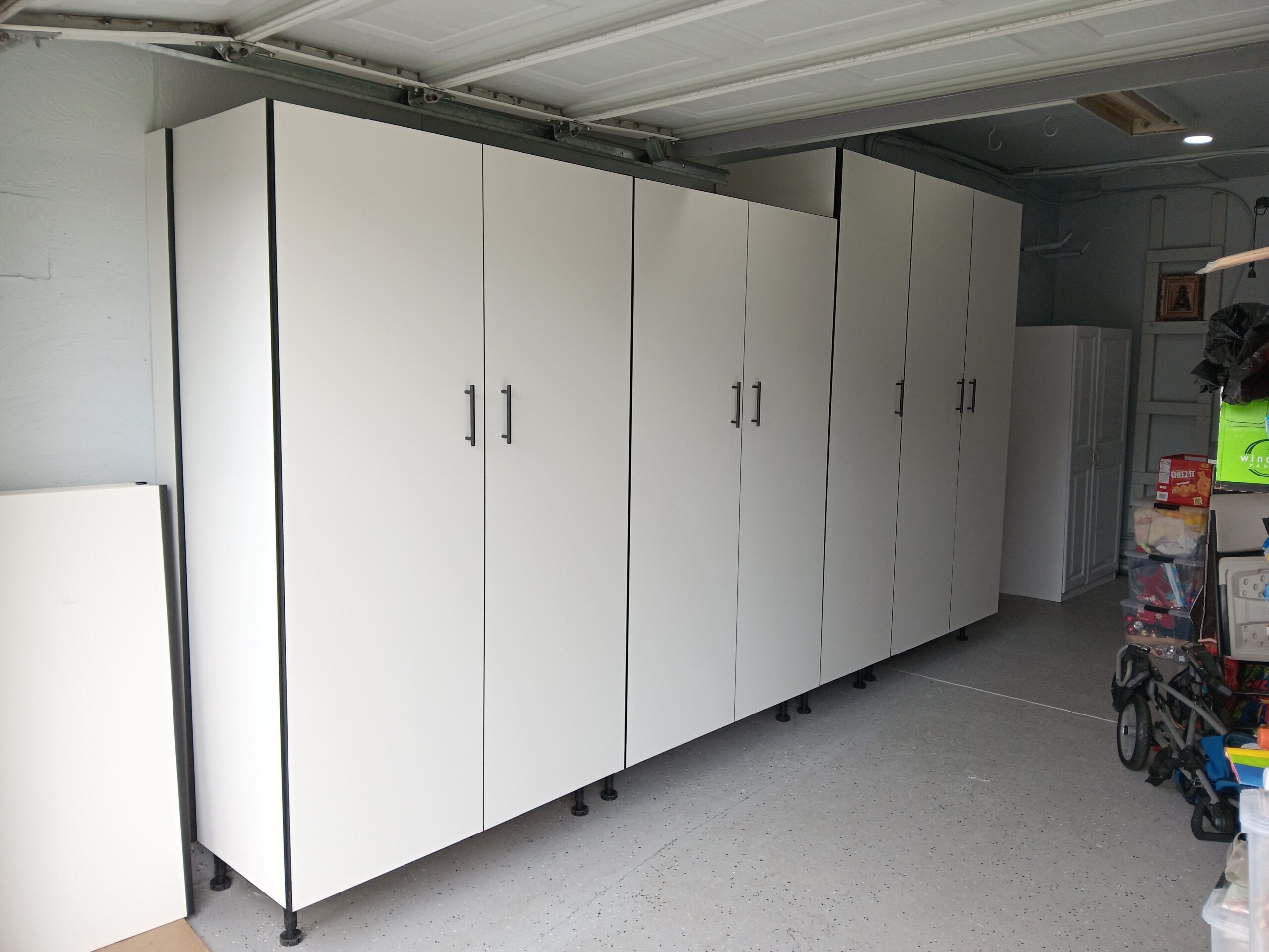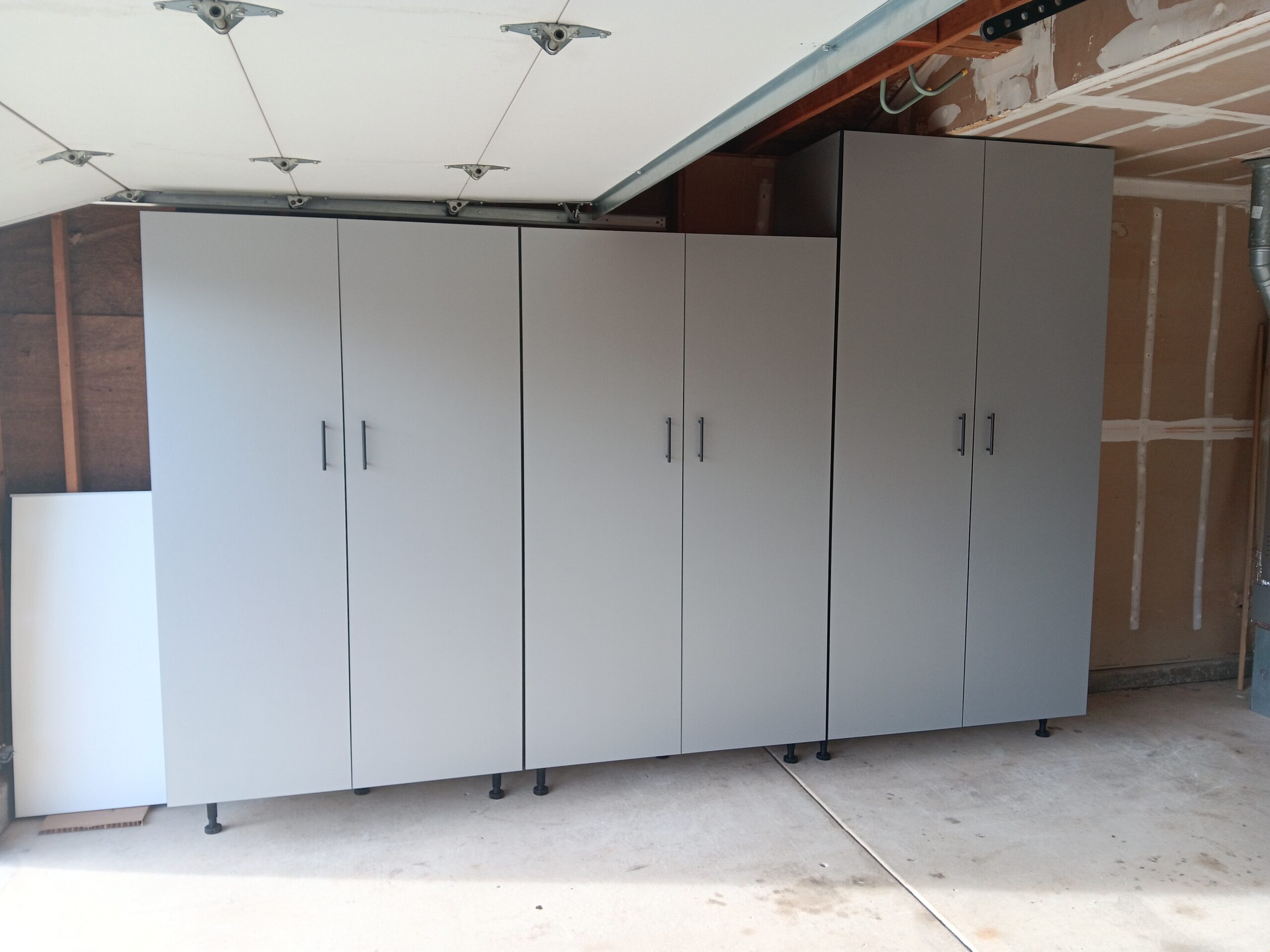 Here at A Better Cabinet & Design, we manufacture Garage Cabinets that are 8ft tall x 4ft wide x 2ft deep (1200 lb. total capacity). Our Garage Cabinets are not what you call butt jointed together but are interlocking together which are tongue and grooved. We have leg levelers on the bottom of our cabinets for additional support. The 4ft wide 2ft deep cabinets come with 5 legs and our 2ft wide 2ft deep cabinets come with 4 legs. Our legs are ordered to fit. The options are 6”, 9” or 12” high depending on how high your stem wall or foundation lip is in the back of the garage floor. Our side panels, tops and bottoms of our cabinets are all 3/4. All our joints are glued together with type bond II glue for the best bond possible.