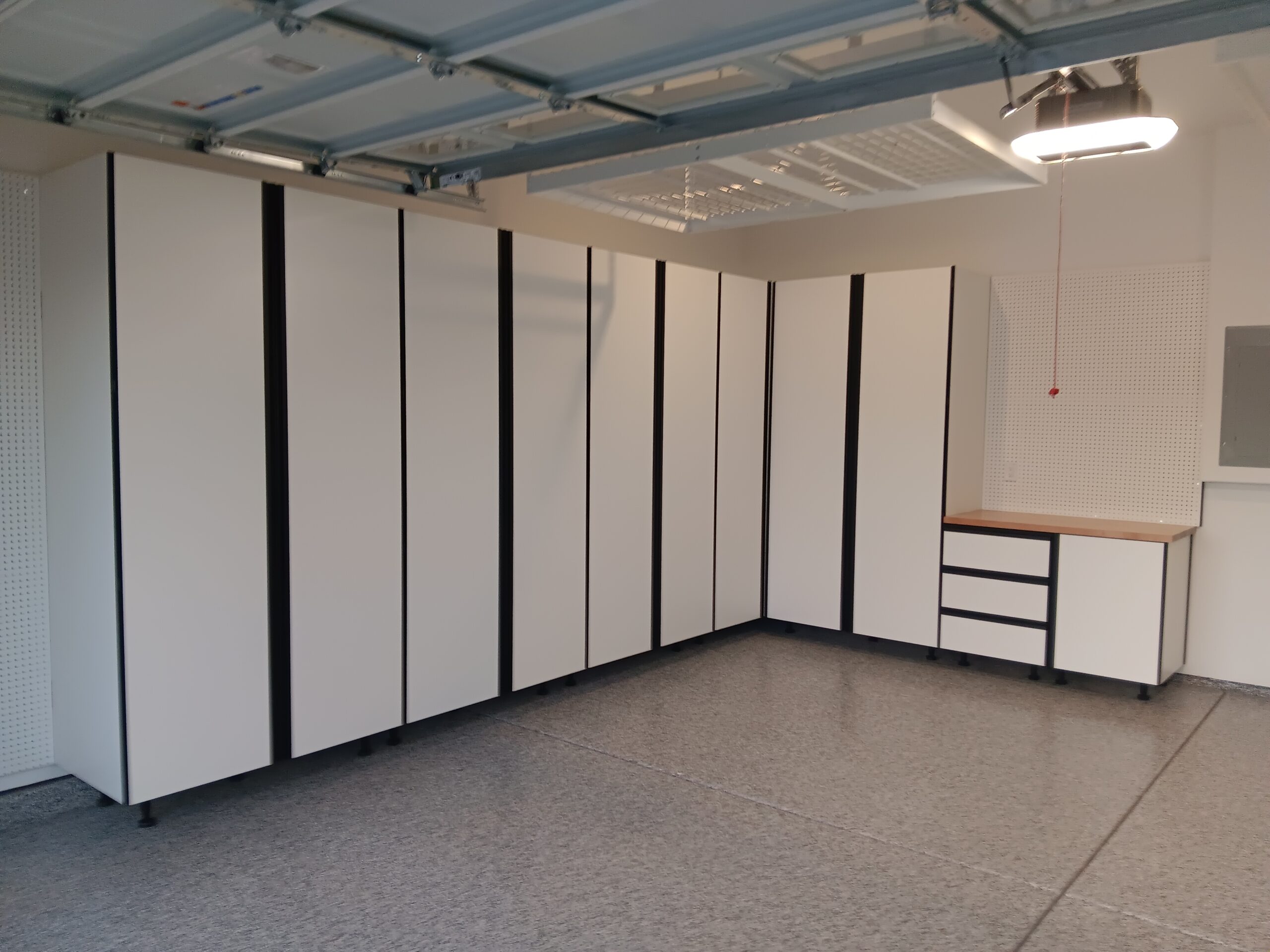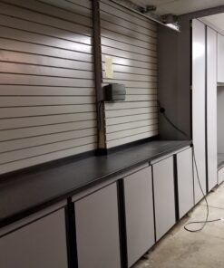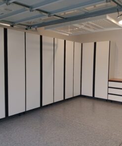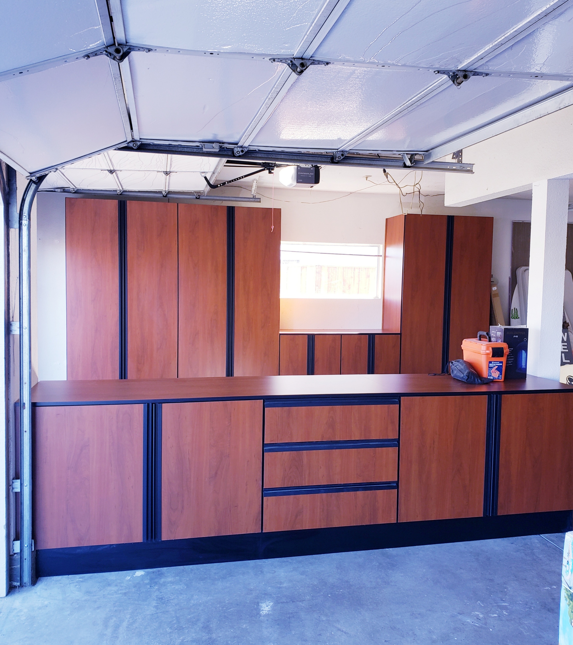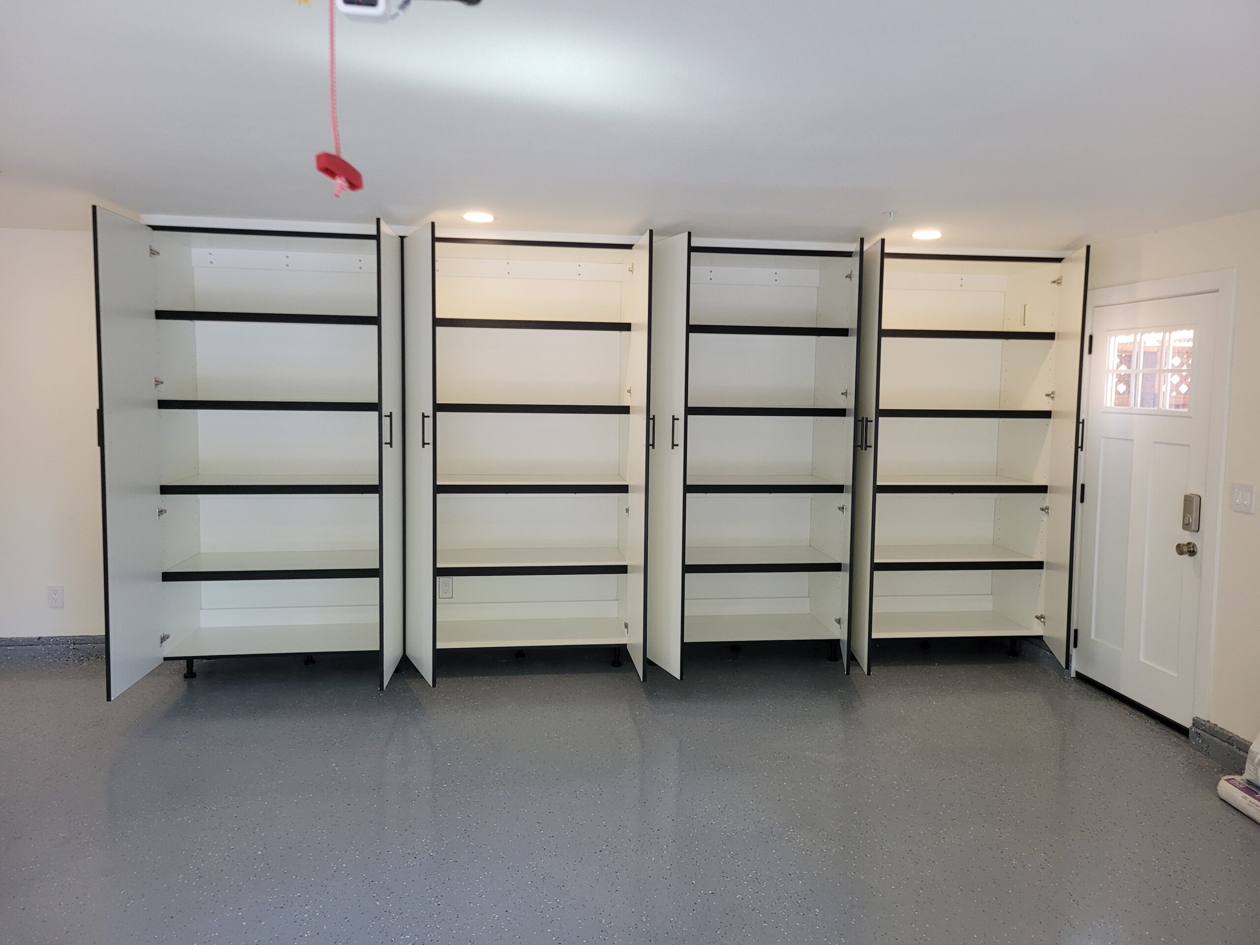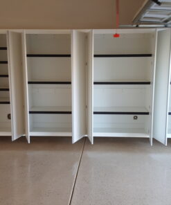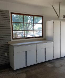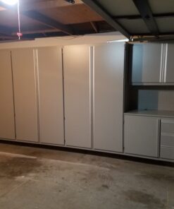 Our garage cabinets are better than other online retailers because of our exclusive metal shelf stiffener on the front of our 3⁄4 shelves (350 Lb. capacity) and of course our 8’ tall x 4’ wide x 2’ deep size. Other retailers only sell 32”-36” wide, 16”-20” deep and 80”-84” tall garage cabinets. We can give our customers a Superior AND Bigger Garage Cabinet for the same price. The other guys only provide 4 cabinets for 12ft when we offer just 3 cabinets.